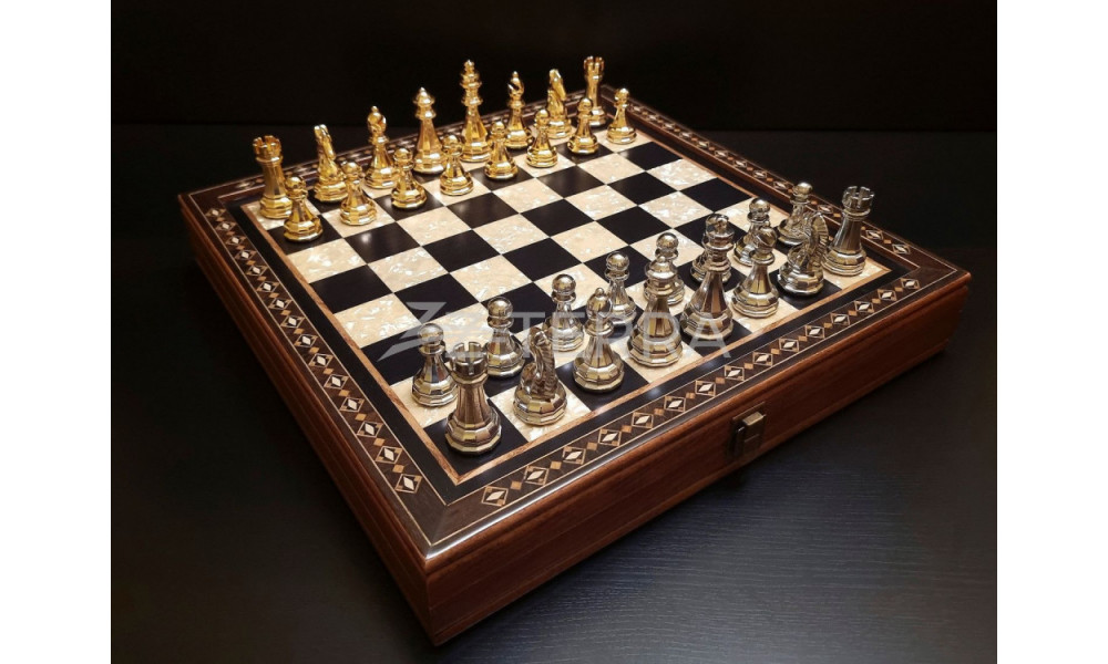 Подарочные шахматы из орехового дерева с бронзовыми литыми фигурами. Украшены инкрустацией натуральным перламутром и шпоном дерева венге. В комплект входят: доска-ларец, бронзовые фигуры (цвет - золото/серебро), сумка-чехол.